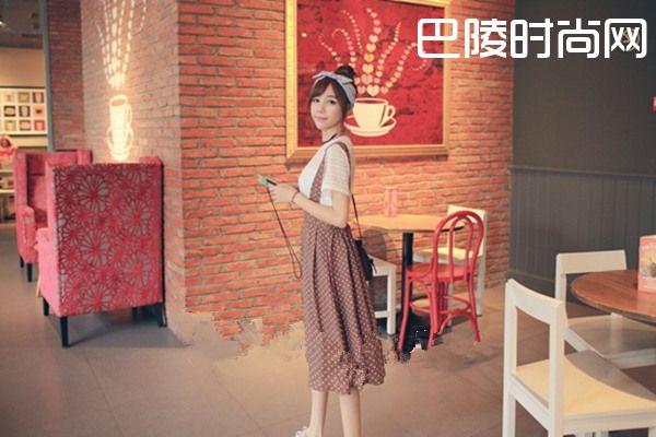 了解到了背带裙在夏季的热销,现在就来看一下有关背带裙的搭配问题,不过前提是要选择一件合适的背带裙,首先给大家介绍的是棕色的高腰背带裙,这款背带裙可以彰显人可爱的一面,这款背带裙可以把大腿的位置遮盖住,即使是很胖的人也可以轻松驾驭这款衣服,这个时候如果搭配上一件白色的T恤就很妙了,简单的搭配却给人不同的感觉。