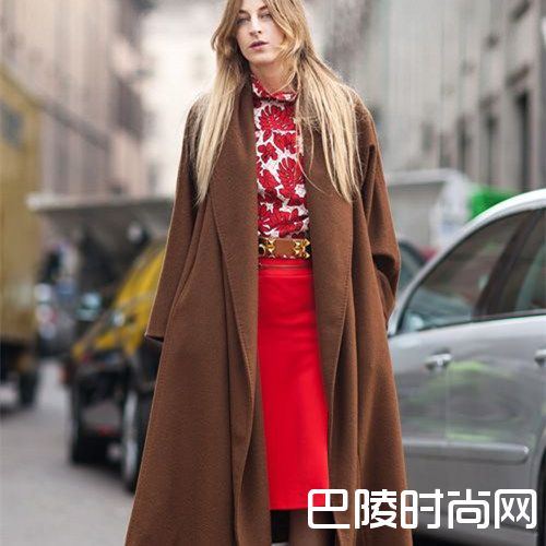 接下来再来看看大红裙和深棕色长款大衣的搭配,我知道裙子的种类有很多,有连衣裙,也有半身裙和短裙,每样裙子的设计也是各不相同的,你看图片中的这款搭配,用红色印花上衣搭配红色半身裙,这种搭配看起来非常精致,整体的搭配十分的抢眼,这个时候如果选择一件低调的深棕色长款大衣外套,整个人看起来就会显得非常的时髦潇洒。