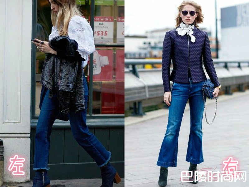 左:机车皮衣人人都有的款式,可是今年却流行这种长款亮皮材质的风衣,黑白搭配中一抹蓝色的牛仔喇叭裤就成了吸晴的源头。