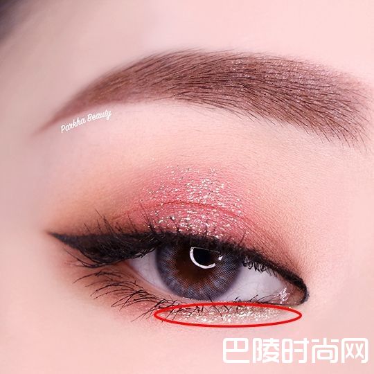 眼睛放大size的诀窍就是在眼下前段打亮,从眼下中段往前画到眼头(红圈处),可以选带有亮片、珠光、浅色系眼影,最近很夯的眼影蜜也是拿来打亮卧蚕的神器。