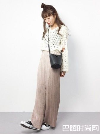 宽版的百褶有大家闺秀的气质,而细致的百褶搭配上光泽感的面料则是时髦女士的专属单品。简单搭上针织上衣与帆布鞋款就能让整体感十分出众。