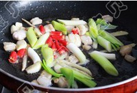 5.转大火,将姜、蒜、小米椒,蒜苗白色部份,倒入麻椒油中翻炒