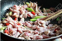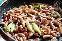 3、将辣椒切成末,和姜片、葱、蒜一同放入油锅里,先炒一炒,随即放入料酒、酱油、糖及少量醋,炒至糖溶化,倒入猪肉,同炒半分钟,出锅时,浇一些香油即成。