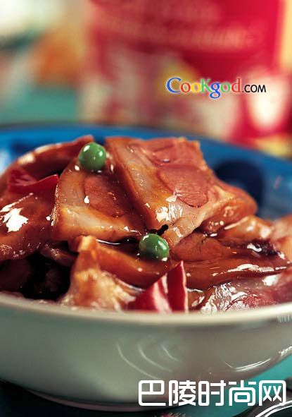 2.锅内放油,烧热,加蒜片、郫县豆瓣爆香,放入猪头肉、笋片、辣椒、青豆、酱油煸炒,加糖、味精后淋上红油即可。