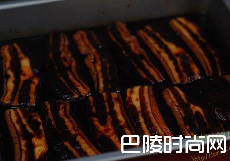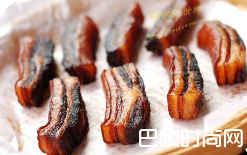 做法(1)腌渍。先把猪肉切成5厘米宽的长条,用竹扦扎上许多小眼,再用
