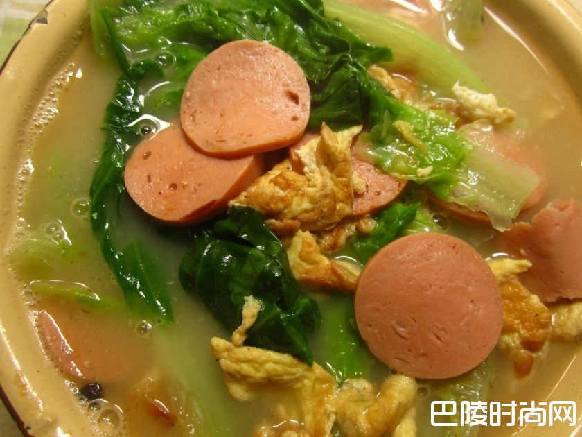 火腿肠蛋汤美好火腿肠、鸡蛋两个、生菜、鸡精、盐、胡椒、油
