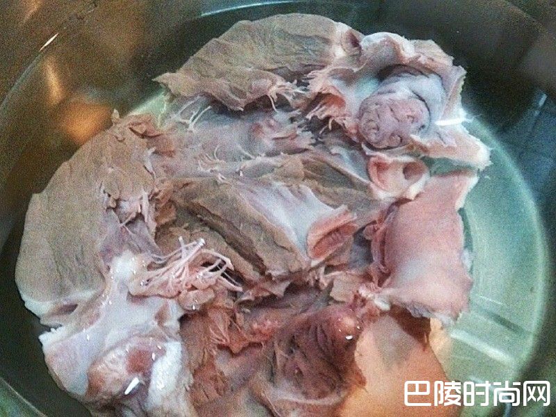 2切好剖开的心脏.流动的水.将里头的血块清除洗净.放入锅子装水浸泡.至少3小时.我个人是浸泡半天.浸泡的期间.隔一段时间要换水.顺便挤压猪心.让肉里的血水带出.降低腥味.持续浸泡.