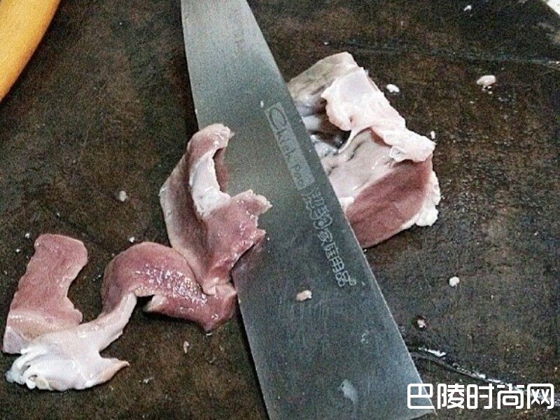 3浸泡半天的猪心.血管口感比较Q弹有嚼劲.跟肉分开.单独比较好入口.剩余的肉块.整块切三等份.每一等份.用刀子斜切.一片片下来.切越薄越好入味.