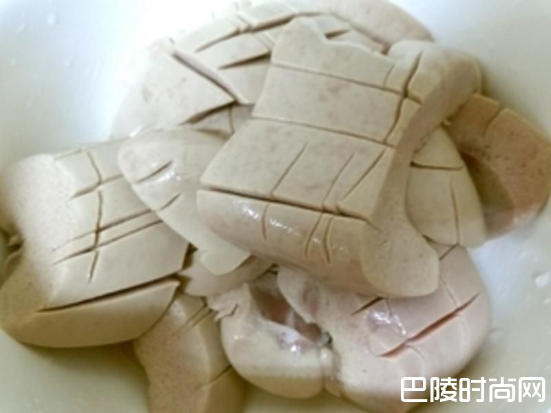 1猪腰子切厚片正面划刀花用热水川烫半熟后 马上捞出浸泡冷水备用浸泡冷水可以保持腰子的脆度