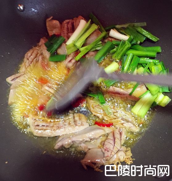 33.锅内烧热油,将切好的大蒜、姜米下锅爆香后倒入准备好的腰花,快速翻炒4、5下后,马上将调好的辅料和大蒜苗倒入锅中,再翻炒4、5下即可出锅。