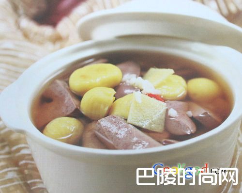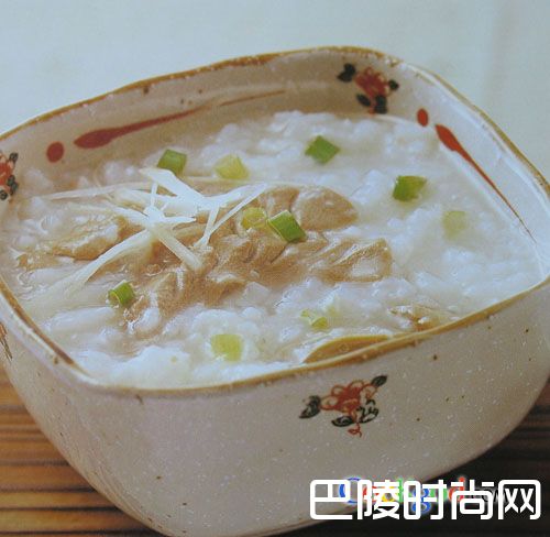 2、将净锅上火,放入清水、粳米、姜片,大火烧开转小火炖25分钟,放入板栗、猪腰再炖15分钟调味即成。