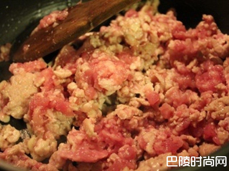 3、加入辣豆瓣酱,同肉末翻炒均匀;