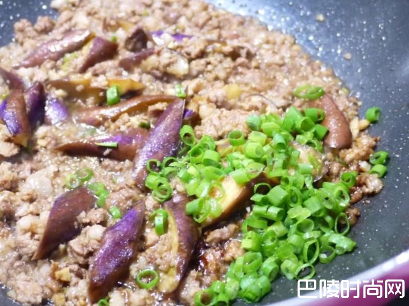 6加水并盖上锅盖,烧至茄子软烂入味后,撒上葱绿,即可盛盘上桌