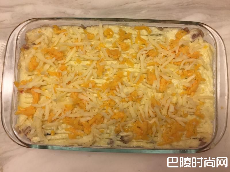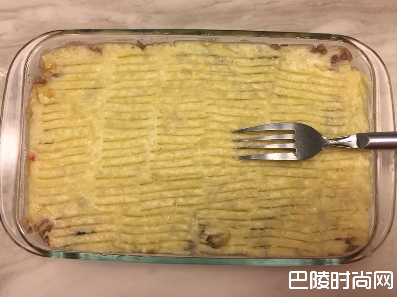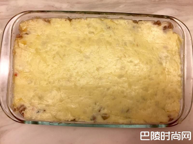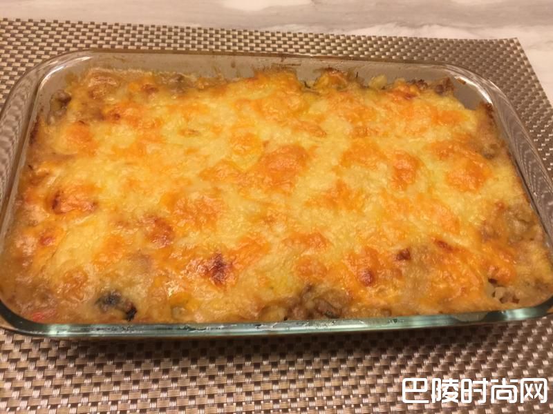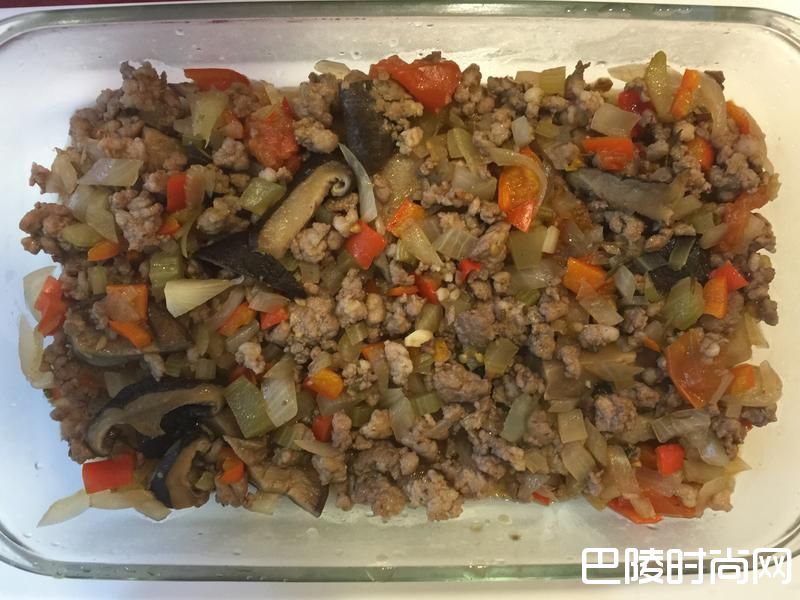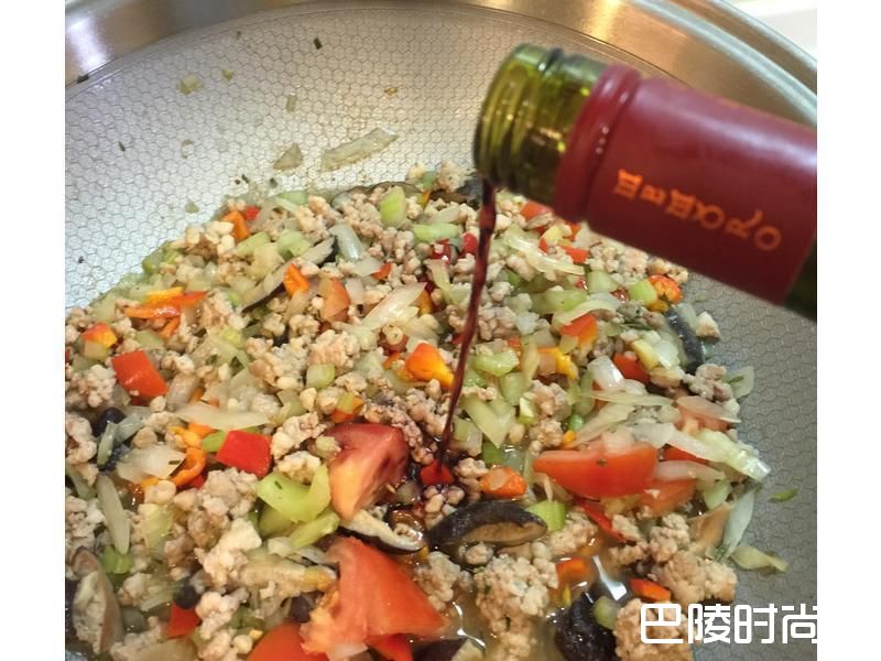4加入炒熟的香菇、绞肉、红酒、蕃茄酱,盖上锅盖煮20分钟