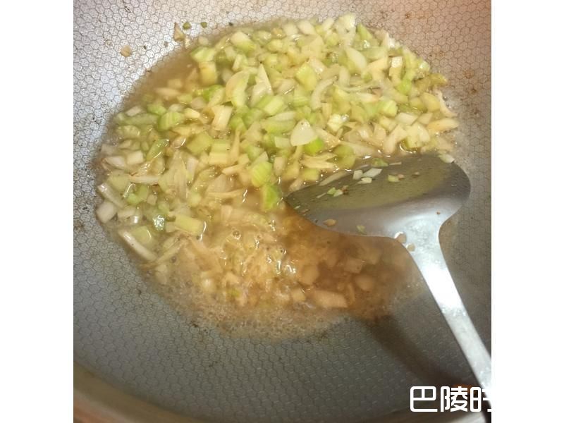 3同一个锅子放入少许油炒洋葱、西洋芹至蔬菜稍微变透明,加入盐、水盖过蔬菜