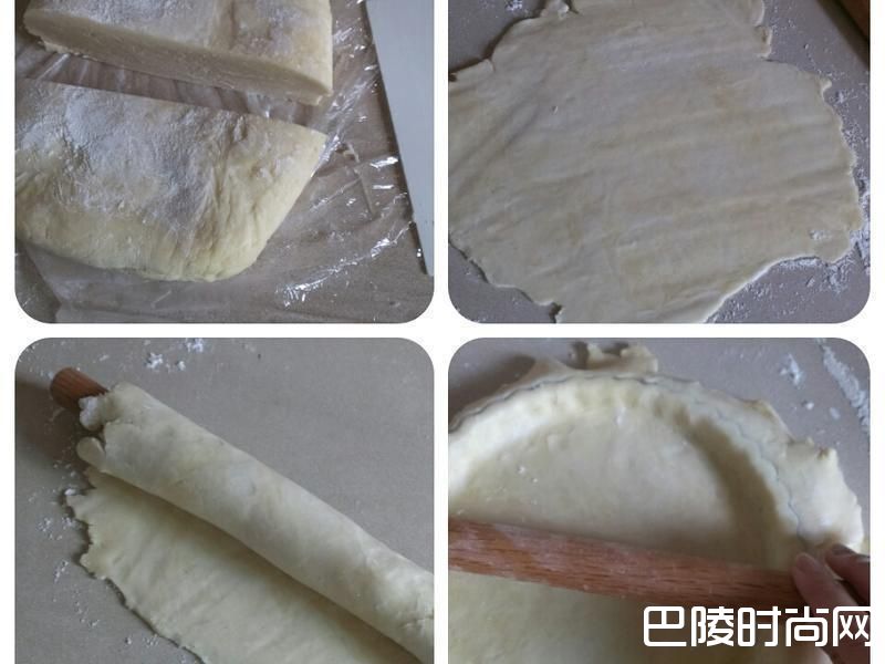 3取出派皮切成两等分,尚未操作的部分包好放回冷冻库。将工作桌面与手撒上一些高筋面粉做手粉防沾黏,将冷冻过后的面团以敲、打、拍、擀的方式,擀成厚约0.5公分、比八吋派大的圆形,并以擀面棍卷起饼皮,盖上烤盘模型,将面团提起、放下的方式贴合边缘(不要拉扯),塑型完成切除多于饼皮,放回冷冻放30分钟以上