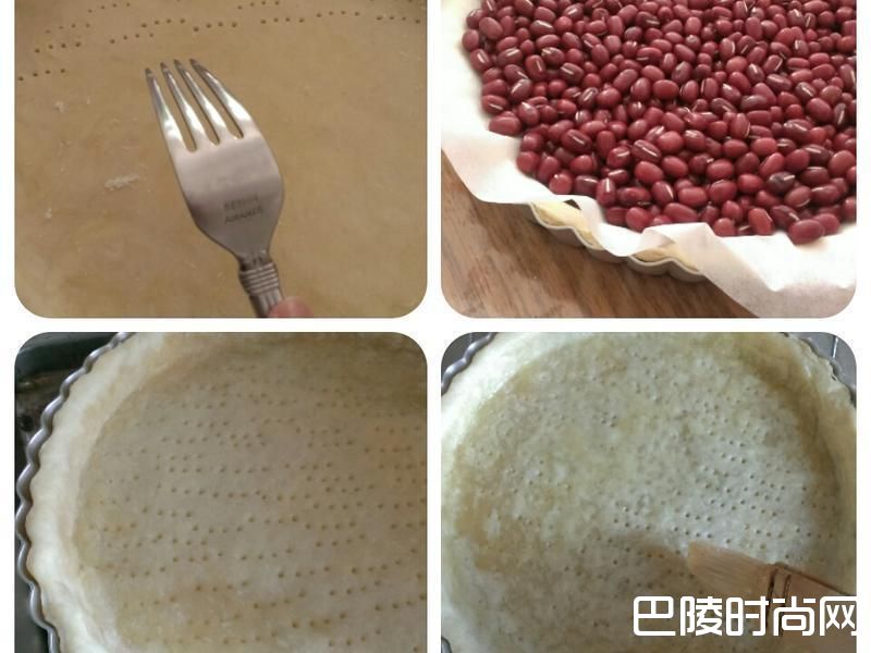 4于稍微冷冻后的派皮底部戳洞,可以避免烘烤的时候鼓起,铺上一张烘焙纸倒入重物进行盲烤(这边使用红豆),以180度烤25分钟,取出上面重物再烤5分钟,离开烤箱后趁热涂一层蛋液,凝固的蛋液可以防止派皮不吸收太多馅料的水分