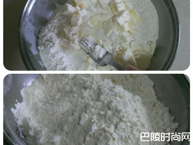1派皮先将无盐奶油切成一公分方块大小,放进冰箱冷冻30小时后,倒进面粉里拿叉子以按压的方式混匀,大约至下图碎屑状即可 (避免使用手指按压,手指温度使奶油融化,派皮烤出来容易不酥脆)
