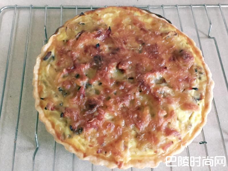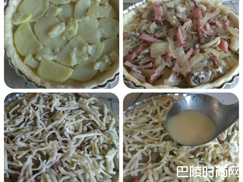 6酱料全脂鲜奶加入鸡蛋拌匀过筛,加入些许盐巴即为蛋奶酱。在放凉的派皮上铺上一层蒸熟的马铃薯为底,将放凉的内馅均匀铺上与派饼同高,在撒上薄薄一层起司丝,慢慢倒入刚刚完成的蛋奶酱,转往烤箱进行烘烤