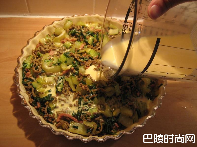 5然后把温凉的馅料均匀舖进派里, 再倒入步骤4鲜奶蛋液。烤箱预热200度后, 进去烤40~45分即可