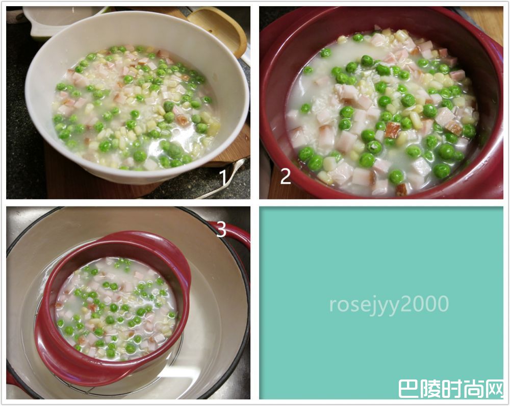 做法一、把米洗净,青豆和玉米漂洗解冻,咸肉切粒,把材料