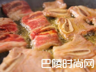 6高火烧热锅,加少许油,将牛仔骨煎至金黄色