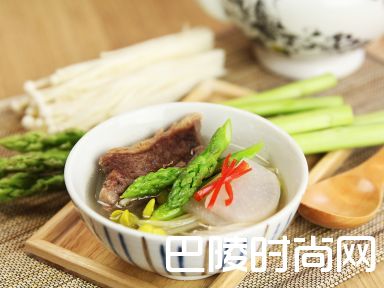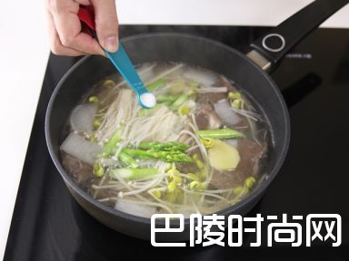 6加入豆芽,金针菇,芦笋和盐。再煮5分钟