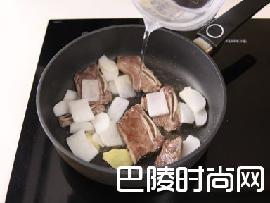 4在锅中加热适量油,加入姜和牛仔骨炒至外表呈金棕色