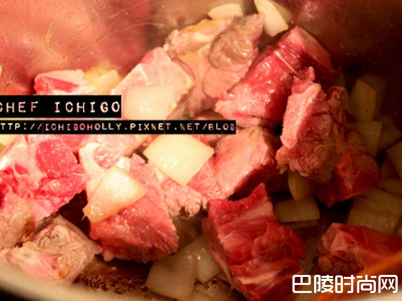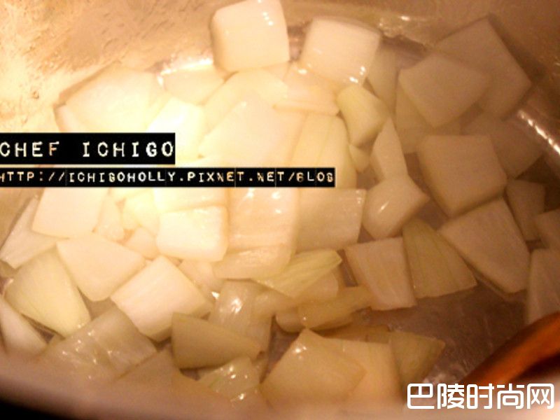 切小块, 在锅里热橄榄油, 到稍稍冒烟的时候放洋葱炒香, 到边缘有一咪咪焦黄