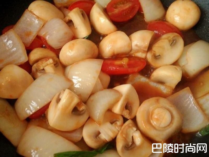 4牛肉汤快完成时,准备热油锅。将葱段爆香,加入番茄酱拌炒一下,再加入酱油、冰糖、洋葱、蘑菇、番茄翻炒。