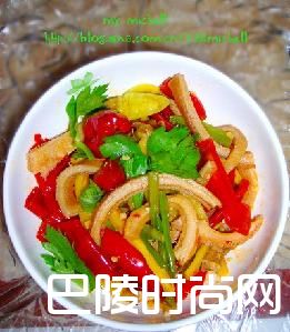 3.锅内放油烧热,下入辣椒丝、肚丝爆炒,加入料酒、鸡汤、生抽、精盐、鸡精炒开。