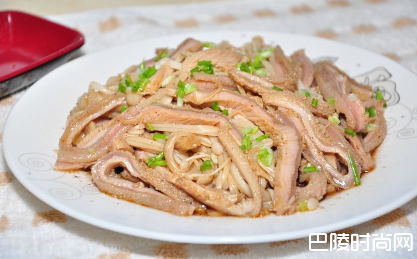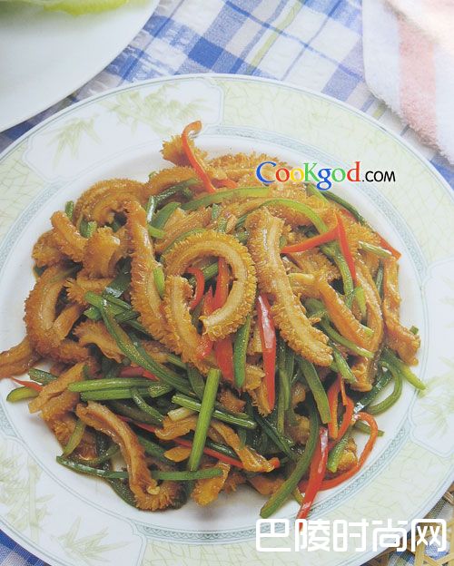 3、炒锅注葱姜油烧热,下入青红椒丝、香菜段略炒,烹料酒,加酱油、味精、盐、牛肚、炒匀出锅即成。