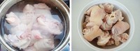 1、水里加一枚八角、适量料酒、姜片烧开,放入洗净的猪蹄膀氽烫3-5分钟,捞起浸泡在冰水里3-5分钟,再捞起洗掉血水;