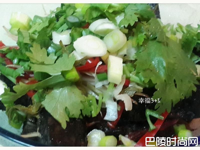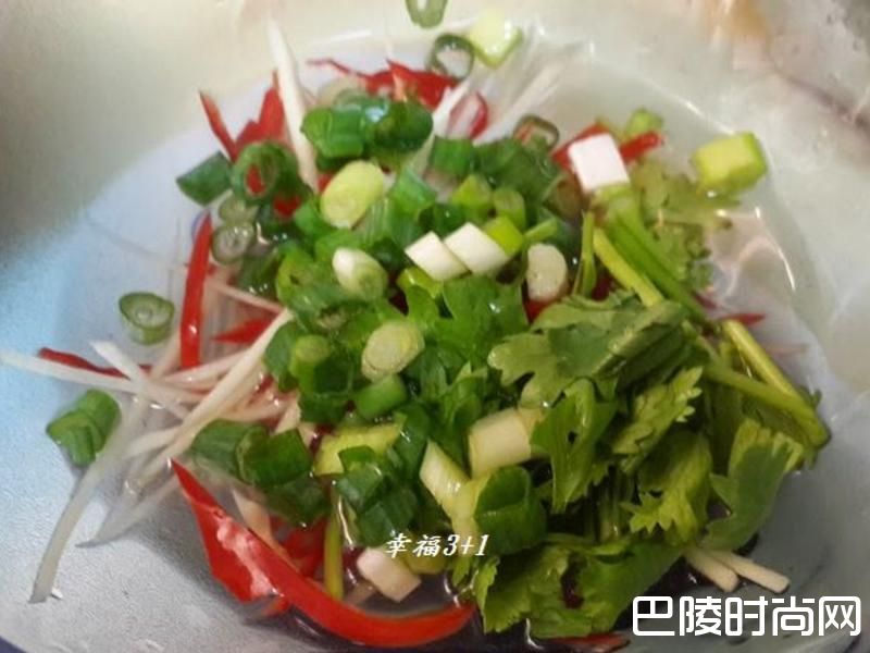 2姜丝、辣椒丝、香菜、葱花备泡水中备用。
