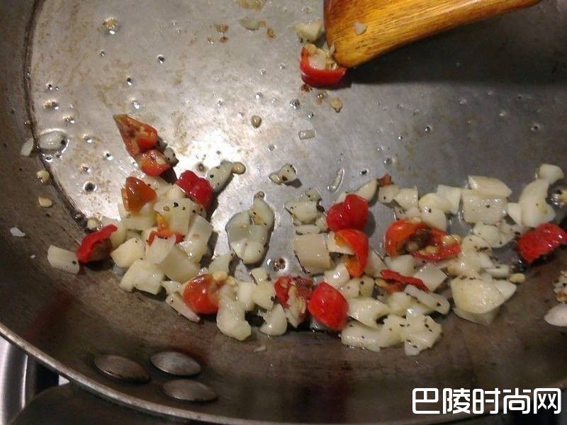 2热锅加入少许的油放入黑胡椒,蒜仁,辣椒,姜丁炒出香气