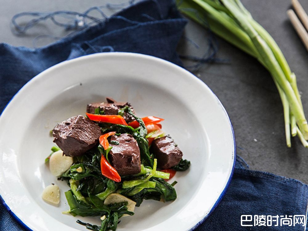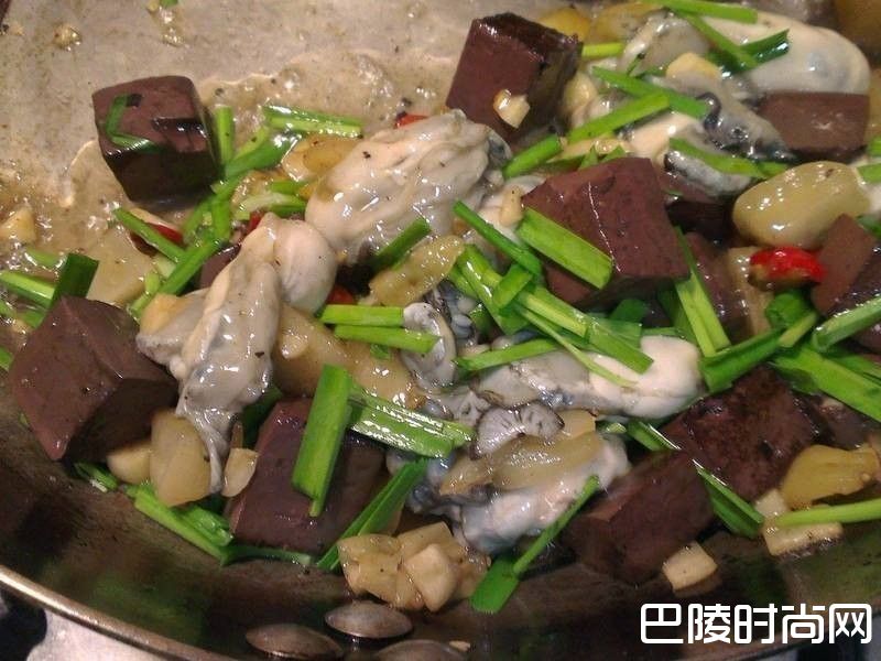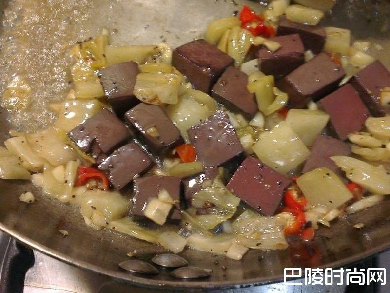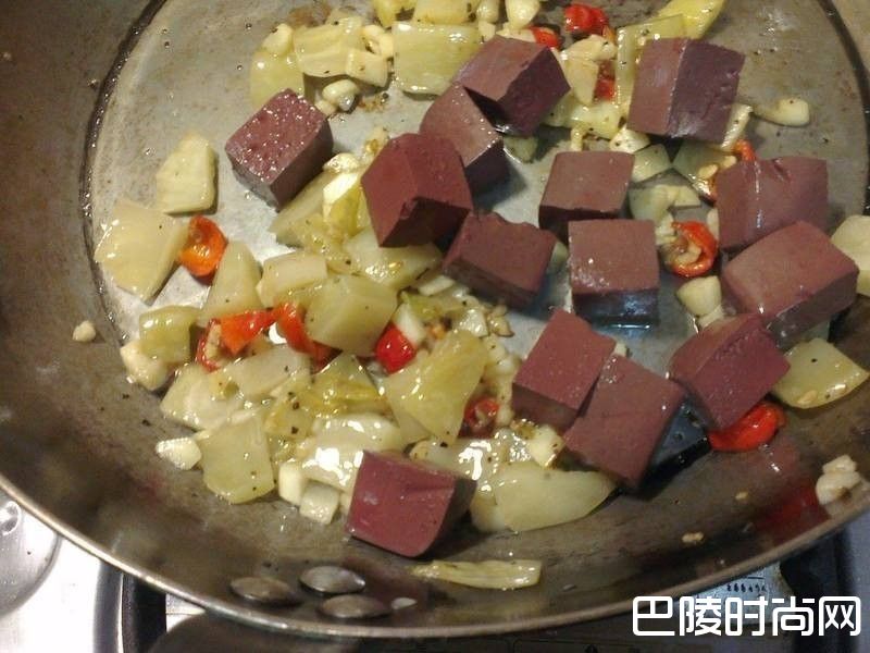 4再加入猪血丁块一起拌炒