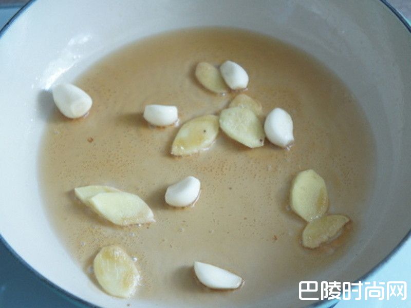 3起一热锅,倒入麻油,再放入姜片和蒜头爆香