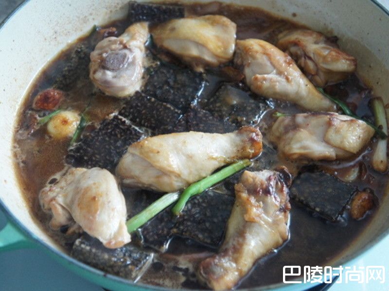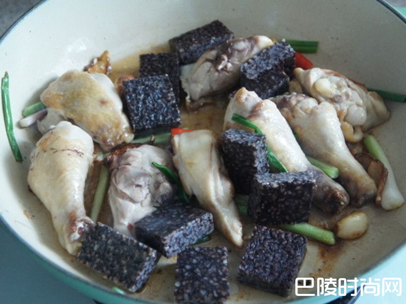 1将鸡肉和猪血糕切块;蒜头去皮;姜切片;辣椒和葱切段