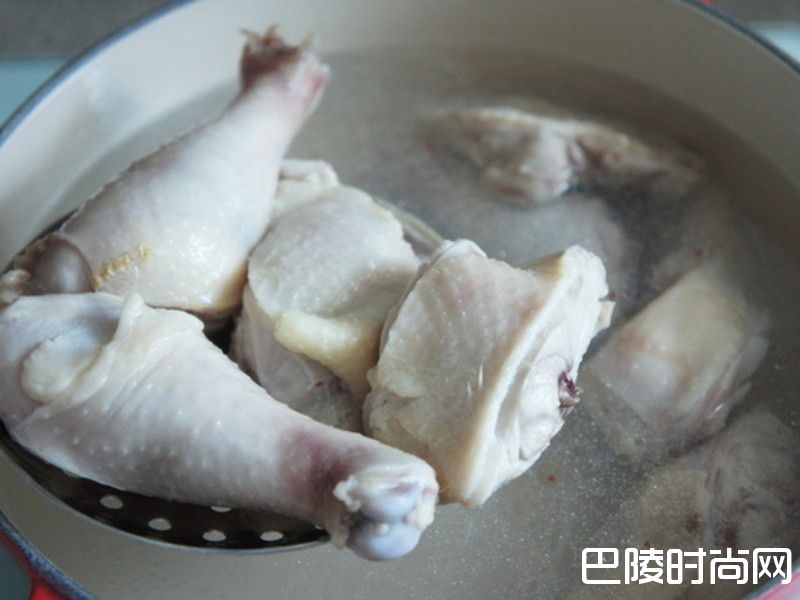 2鸡肉下滚水汆烫后,捞起沥干备用