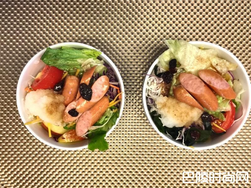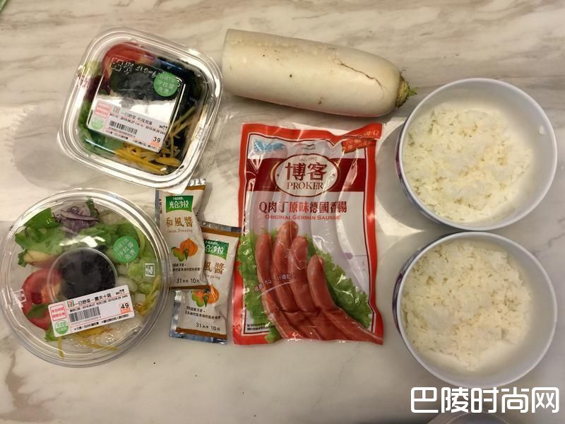 3将生菜舖在白饭上,加上切小块的德国香肠,放上一匙萝卜泥,淋上和风酱,这样其实可以吃了