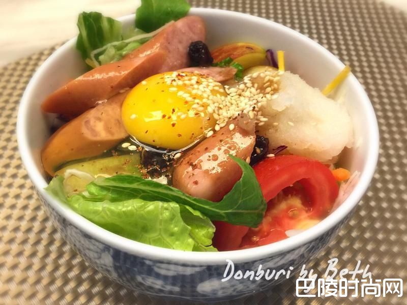 4敢吃生鸡蛋,则将饭中间留一个洞,打上一颗生鸡蛋,撒上白芝麻、七味粉即可