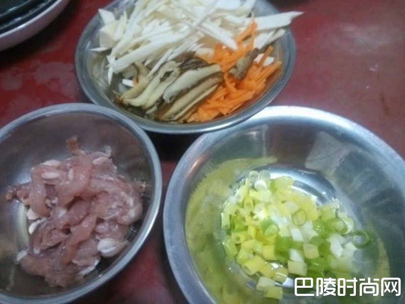 2绿竹笋去壳洗净切丝;新鲜香菇洗净去梗,然后切丝;红萝卜洗净切丝;青葱切成葱花;猪肉丝加入少许味琳,搅拌均匀备用。
