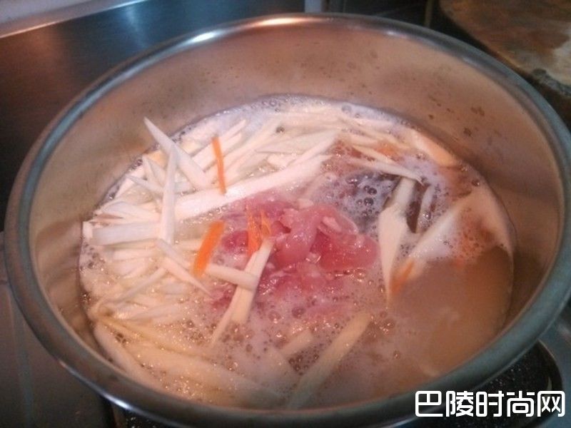 3整锅粥开始沸腾时,就可以将切好的竹笋、香菇、红萝卜丝与猪肉丝都加进去。当再度沸腾时转小火,并且不时的用大汤匙把表面的泡沫捞掉。