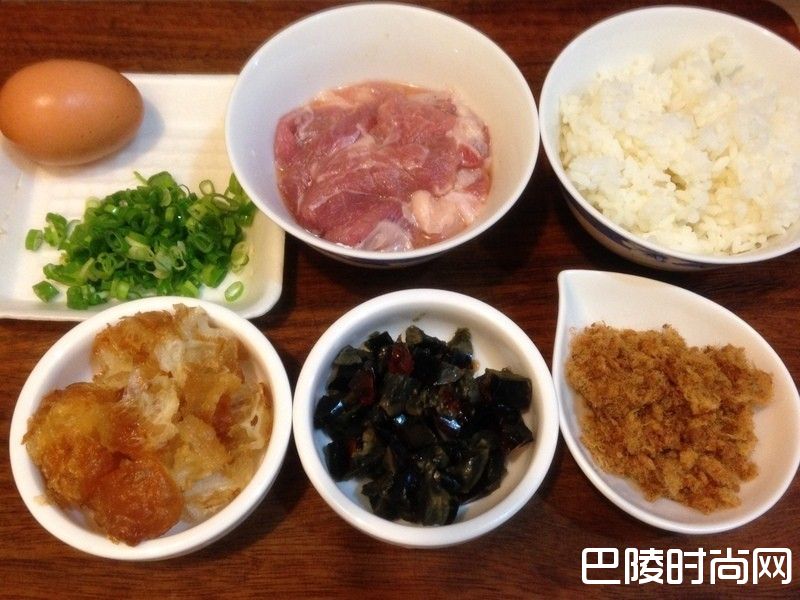 1皮蛋切碎、葱切珠、蛋打成蛋液、肉片洗净备用。