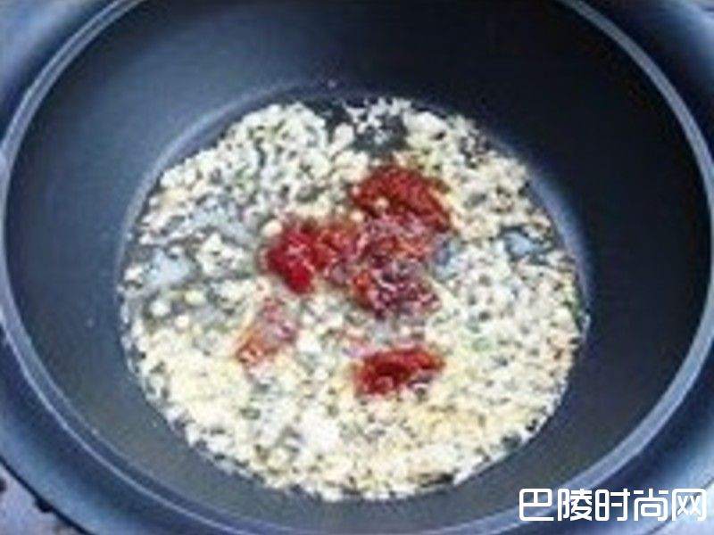 2锅中放油,烧至六成热时依次放入蒜蓉和豆瓣酱,炒30秒左右。