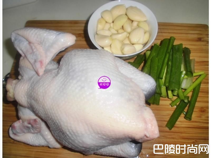 6[全鸡处理]全鸡一只洗干净,安安将鸡翅膀、鸡爪如相片所见折起。蒜头剥皮备用。葱切段备用。干香菇洗净备用。