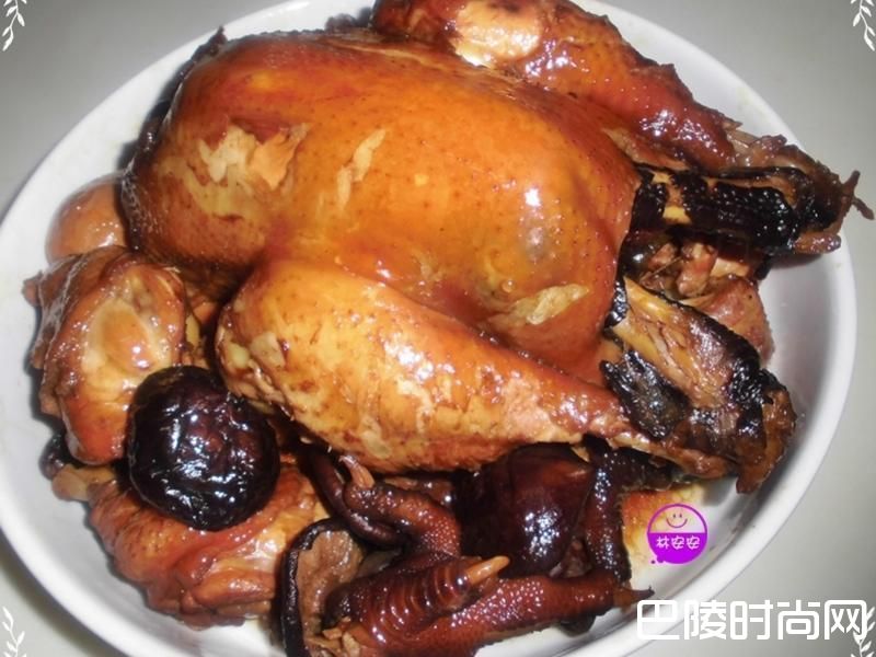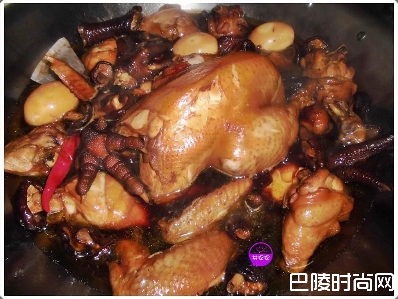 9取一锅先将卤汁中的酱油、二砂、卤包、辣椒略煮至二砂融解。此时倒入玻璃瓶装台湾啤酒1瓶,放入全鸡、鸡腿、鸡翅、鸡爪、干香菇、电锅白煮蛋。食材大致就定位后,加入一大匙水麦芽,让卤好的鸡色泽更美丽。