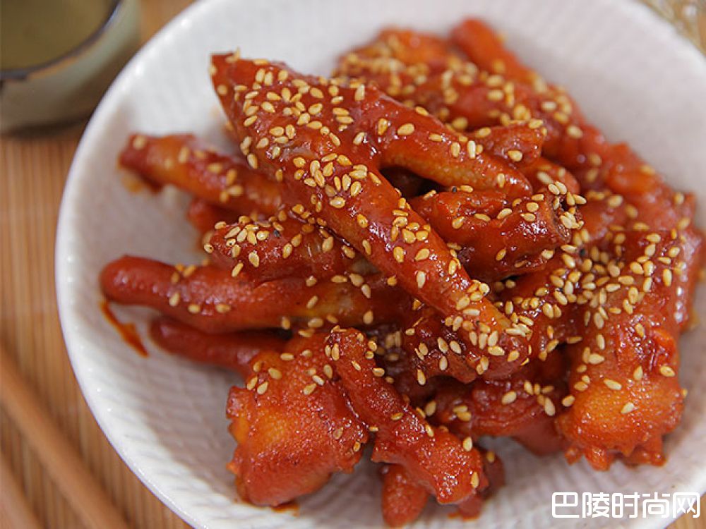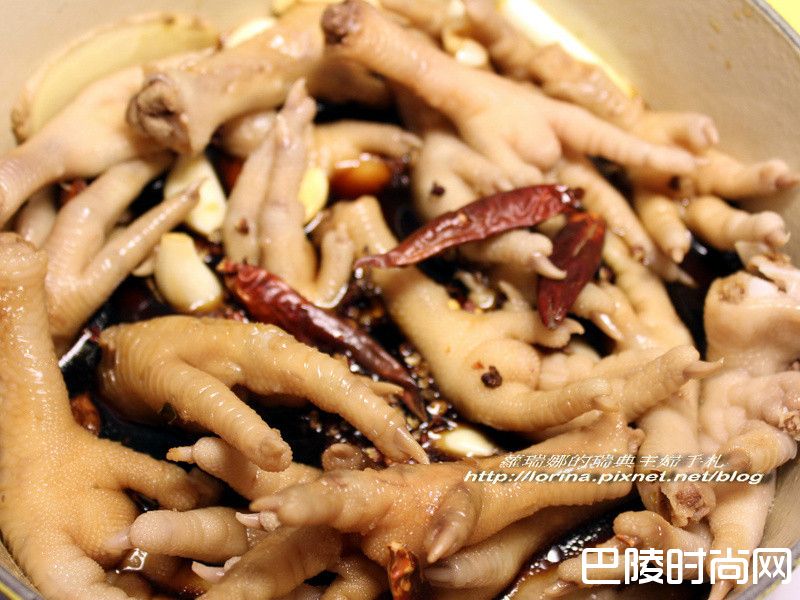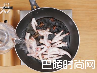 2热锅,加入八角、桂皮、老抽、鸡爪和足量的水,大火烧开,转小火,烧10-15分钟,捞出鸡爪备用;