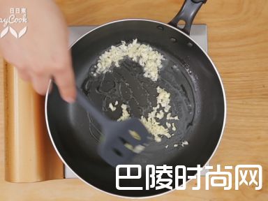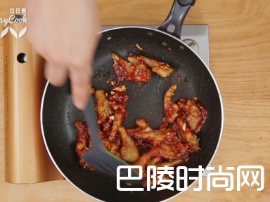4热油锅,爆香蒜末,加入鸡爪、拌匀的酱汁,大火翻炒均匀,加入200毫升水,翻炒均匀,大火收汁;
