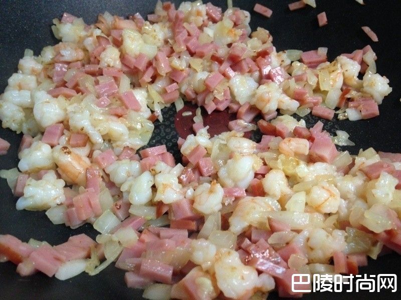4原锅再加入1大匙油,依序将洋葱末、虾仁丁、火腿丁放入炒香。